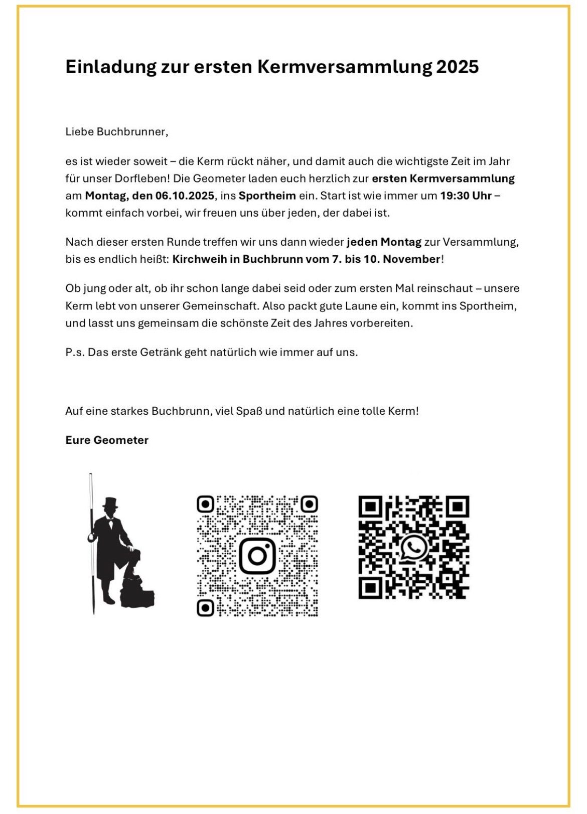 Seid dem 06.10.2025 finden wieder jeden Montag um 19:30 die Offizielle Kirchweihversammlung im Sportheim stat. Wir freuen uns auf euer Zahlreiches erscheinen das wir auch dieses Jahr Gemeinsam wieder eine Tolle Kerm Planen können. Das erste Getränk geht auf uns, also kommt vorbei um alles rund um den Umzug und die Kerm mit uns zu besprechen.